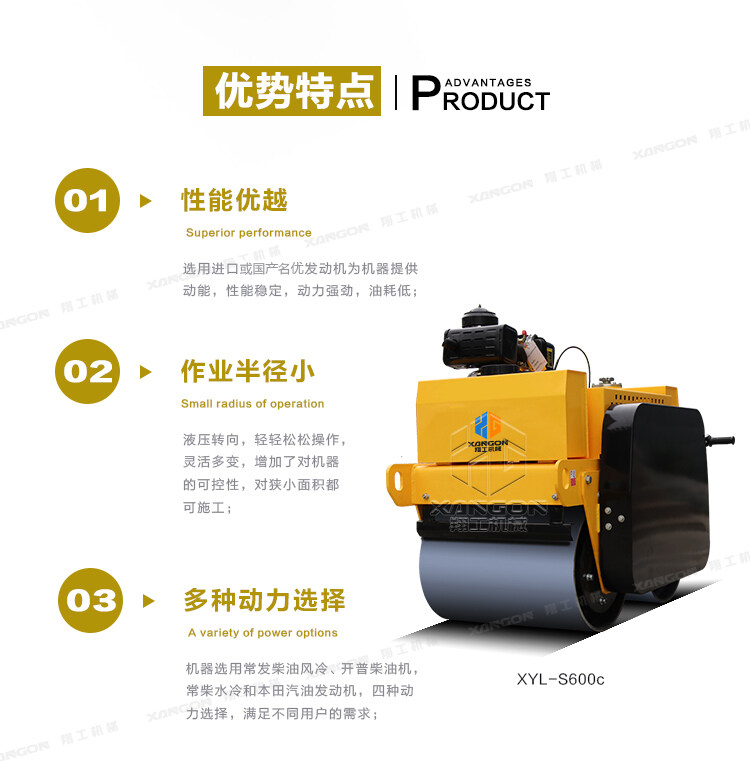 ·柴油動力采用電啟動,輕便靈活換向機(jī)構(gòu);雙驅(qū)雙振,保證了整體的壓實(shí)和爬坡能力;