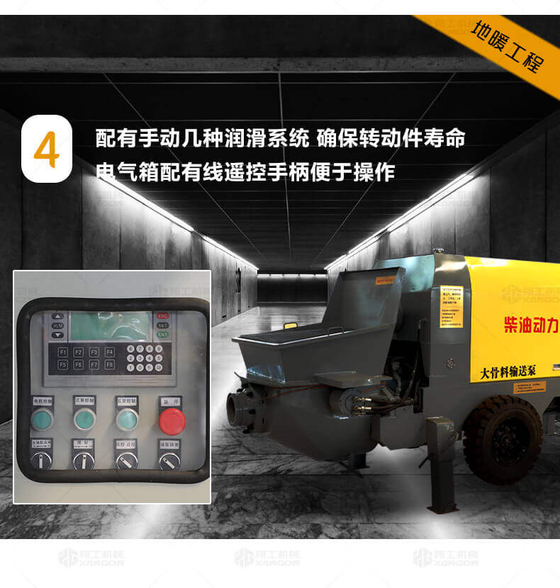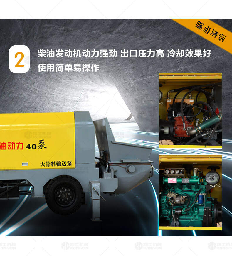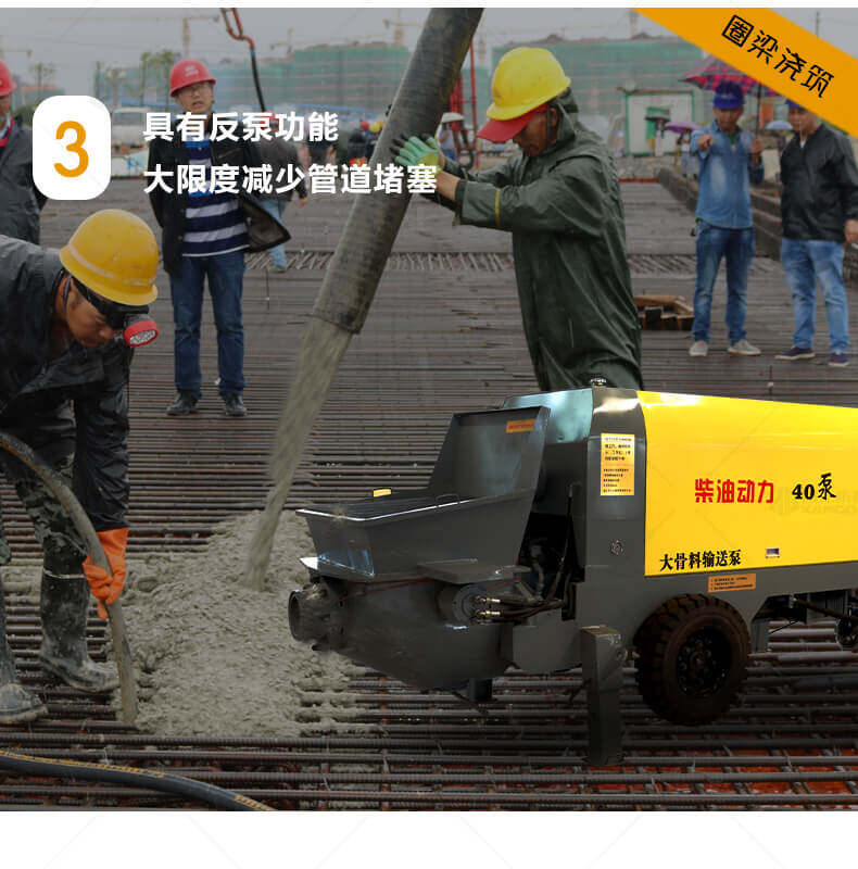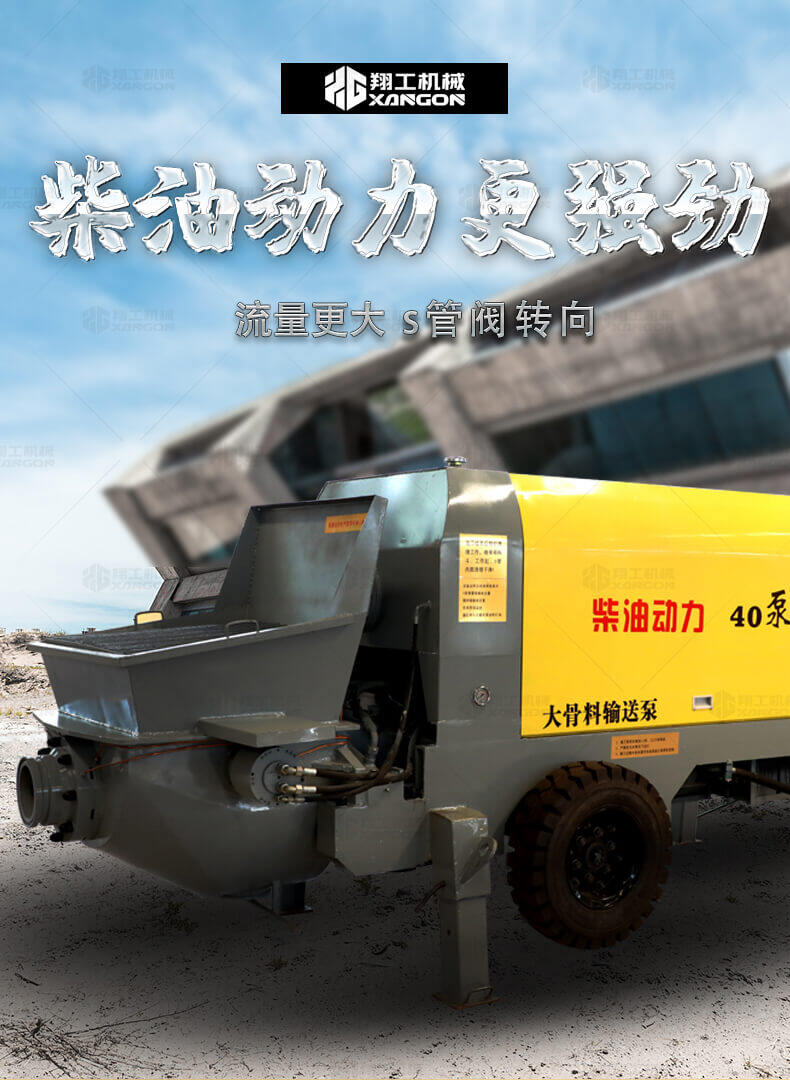 大骨料混凝土輸送泵主要用于坡道灌漿、水平地面、隧道澆筑。模板灌漿等。移動(dòng)便捷全部采用快接式管道卡,提高工作效率 。